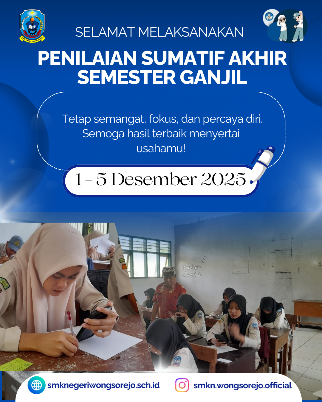Banyuwangi, 2 Desember 2025 – Sekolah Menengah Kejuruan Negeri (SMKN) Wongsorejo melaksanakan Penilaian Sumatif Akhir Semester (SAS) Ganjil tahun ajaran 2025/2026, yang berlangsung mulai tanggal 1 hingga 5 Desember 2025. Kegiatan ini menjadi tolok ukur akhir capaian pembelajaran siswa selama satu semester.