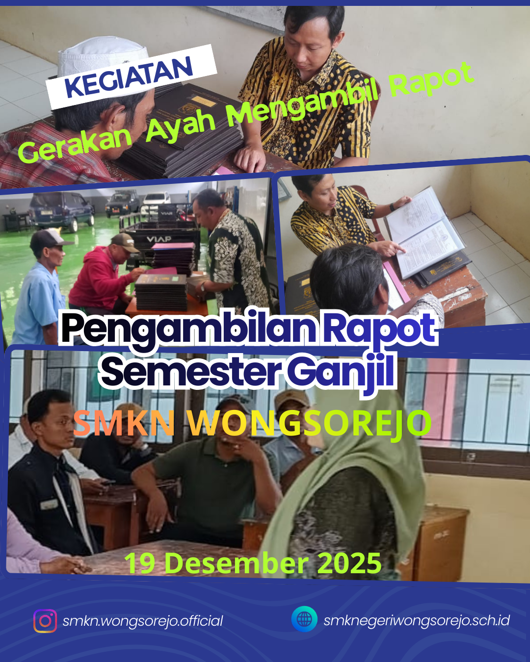 WONGSOREJO (19/12/2025) – SMK Negeri Wongsorejo sukses menyelenggarakan kegiatan pembagian rapot semester ganjil tahun ajaran 2025/2026 pada Jumat hari ini. Momen ini menjadi istimewa dengan digalakkannya program GEMAR (Gerakan Ayah Mengambil Rapot) yang bertujuan untuk mendorong keterlibatan aktif sosok ayah dalam memantau perkembangan pendidikan anak di sekolah.